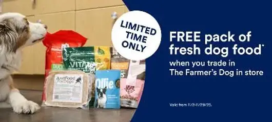 Limited time only! Free pack of fresh dog food when you trade in The Farmer's Dog in store.